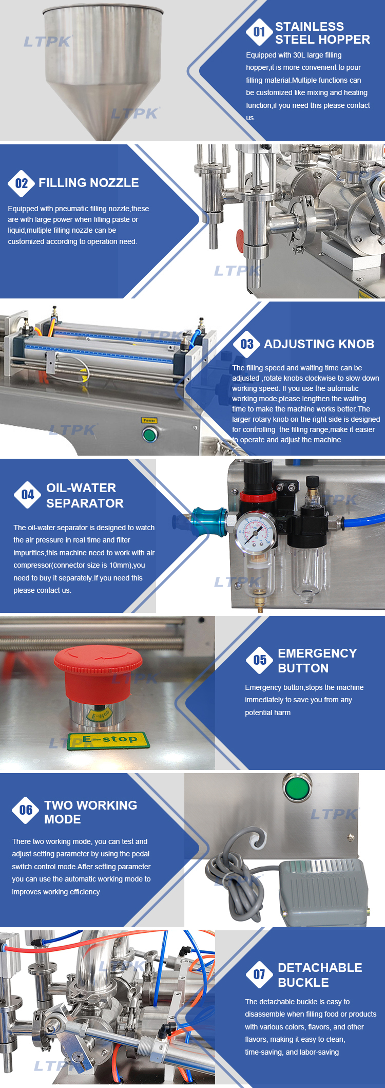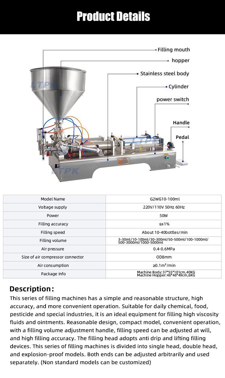 G1WG is a semi-automatic horizontal pneumatic filling machine designed for paste and high viscosity liquids. Made of food-grade SS304 stainless steel, it features stable performance, anti-drip nozzle, easy adjustment and wide application for honey, sauce, cream, shampoo, cosmetics and other pastes.