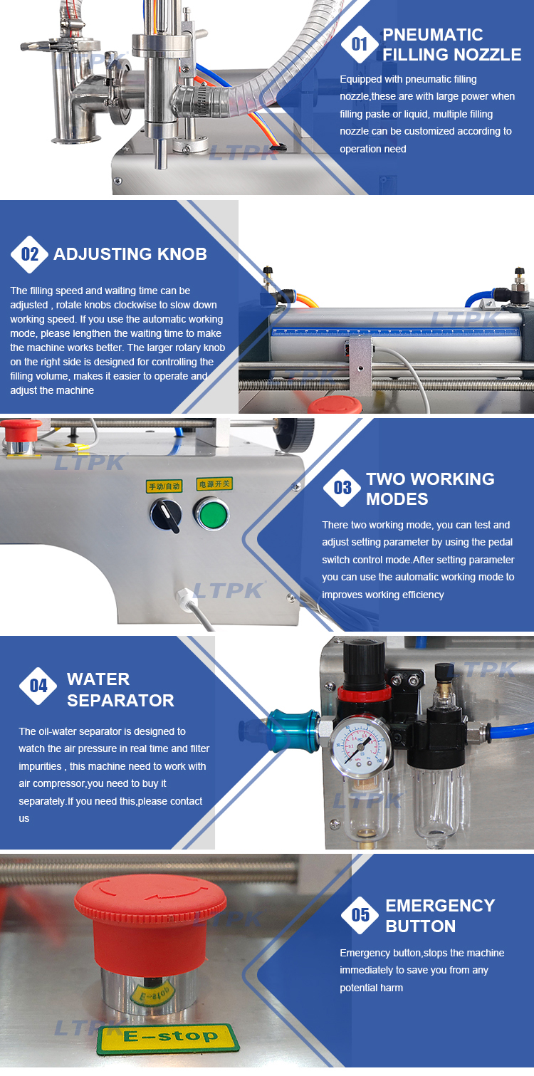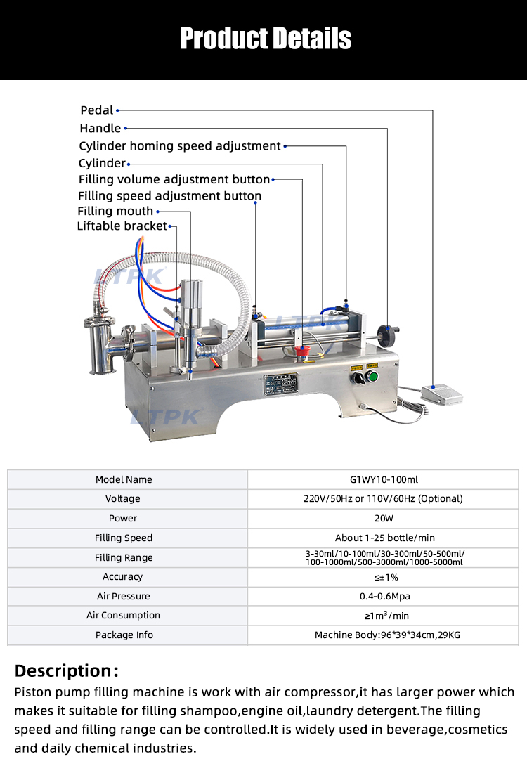 Piston pump filling machine is work with air compressor,it has larger power which makes it suitable for filling shampoo,engine oil,laundry detergent.The filling speed and filling range can be controlled.It is widely used in beverage,cosmetics and daily chemical industries.