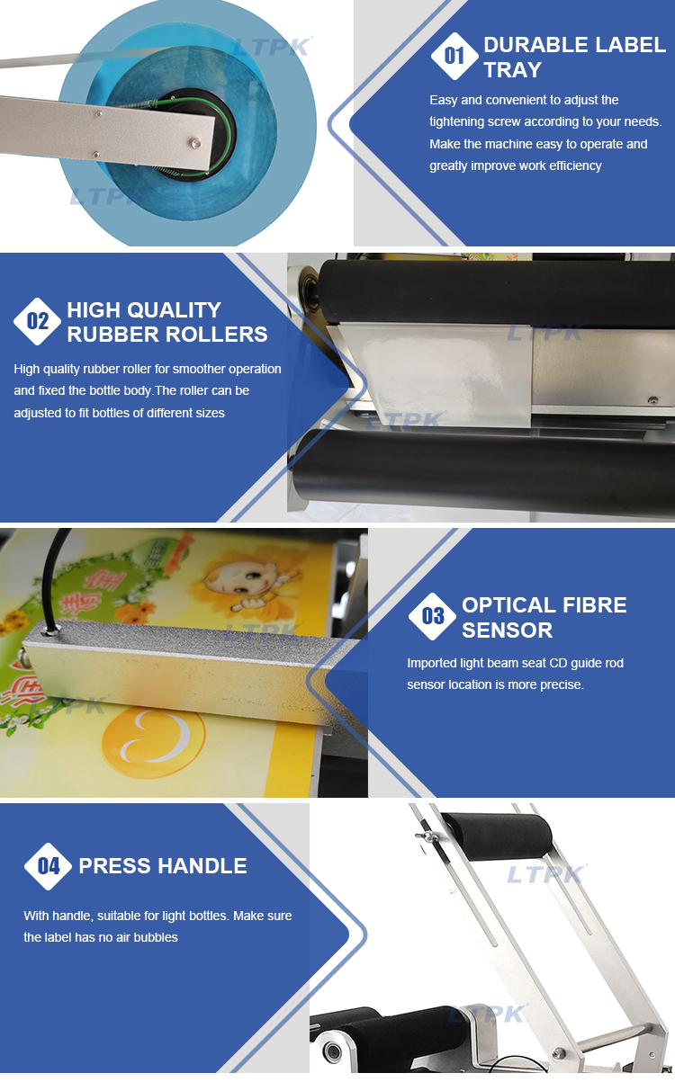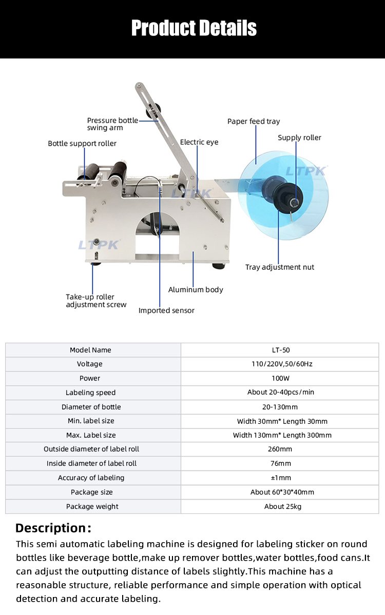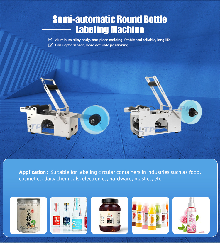 This semi automatic labeling machine is designed for labeling sticker on round bottles like beverage bottle,make up remover bottles,water bottles,food cans.It can adjust the outputting distance of labels slightly.This machine has a reasonable structure, reliable performance and simple operation with optical detection and accurate labeling.