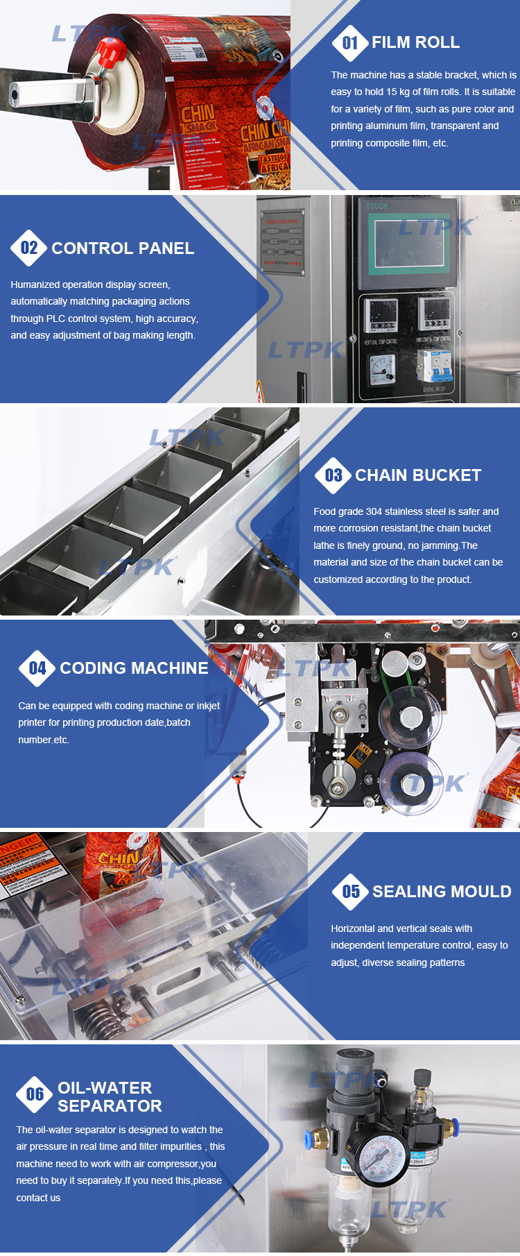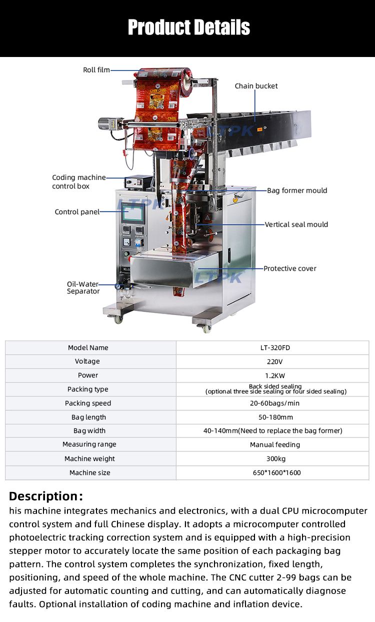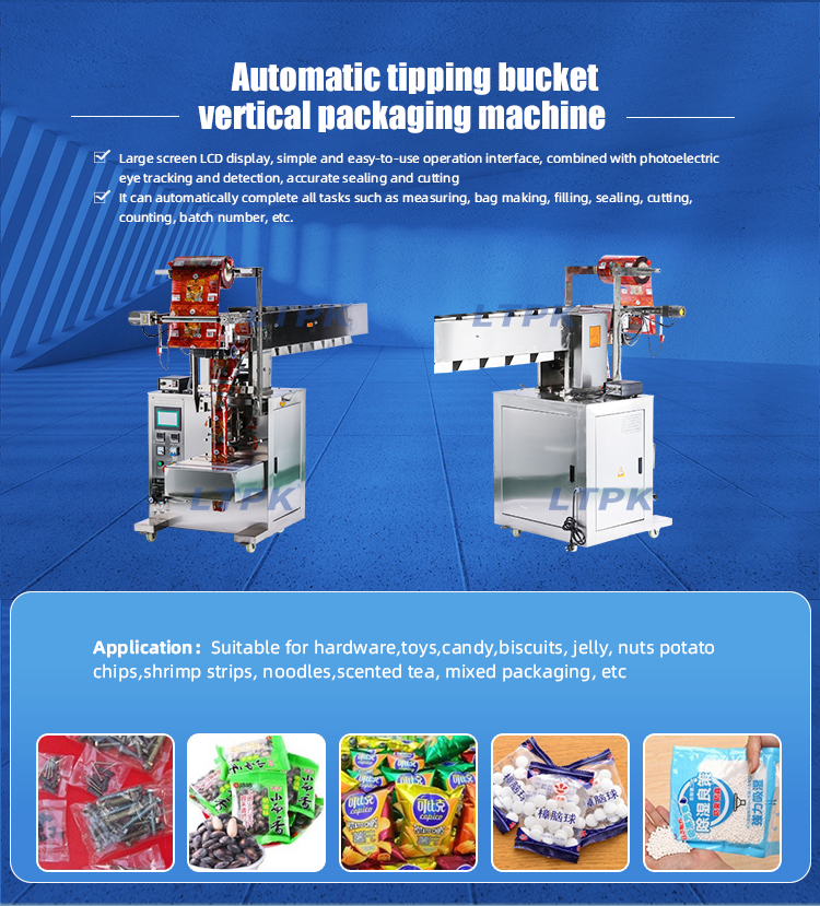 LT-320FD Automatic Tipping Bucket Vertical Packaging Machine Hardware Toys Candy Biscuits Jelly Nuts Three Side Sealing Packer